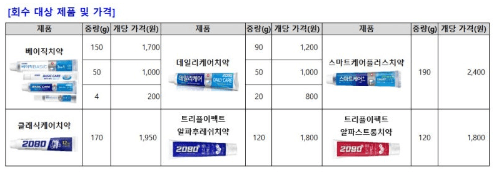 다음과 같은 2080 치약 6종이 환불 회수 대상입니다.